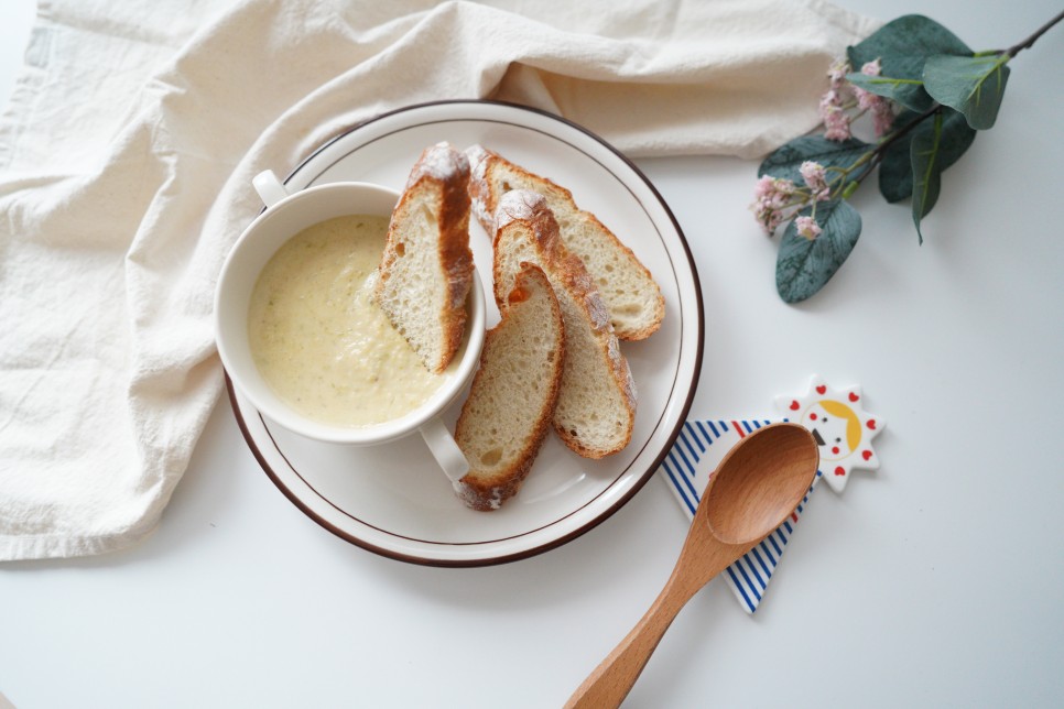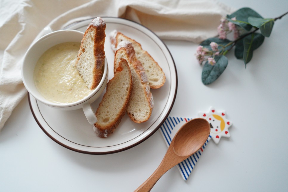 호감 스프에 바게트 빵을 곁들이면 아침식사로 든든합니다.