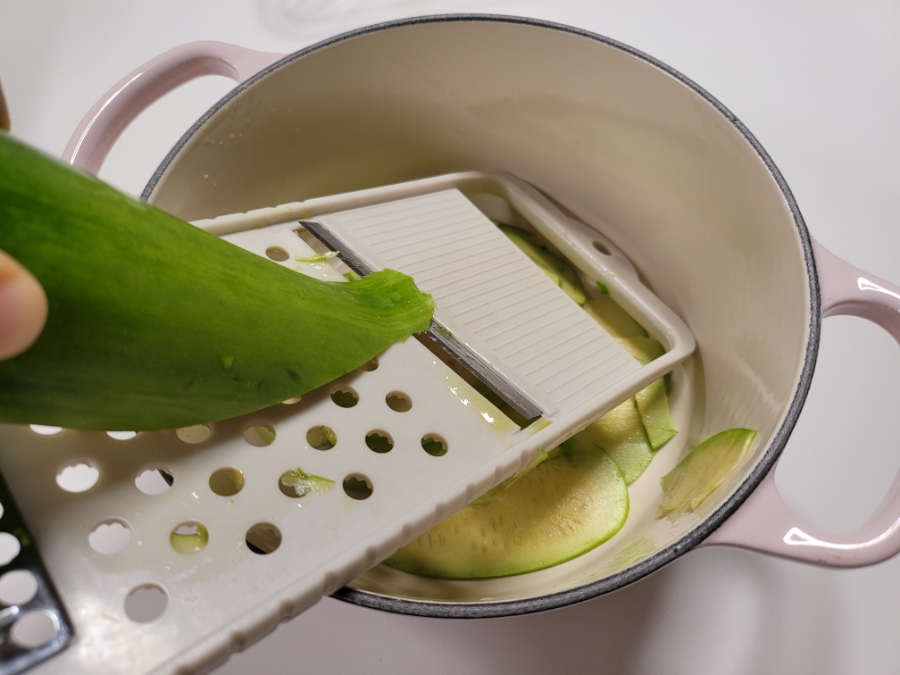 채칼로 호박을 썰어줍니다.