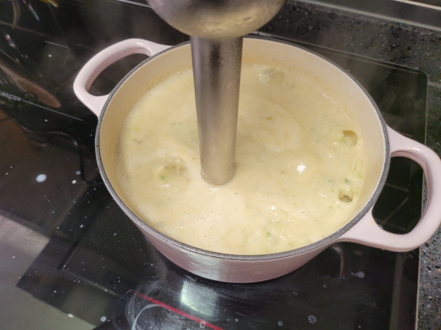치즈가 녹으면 핸드믹서기로 재료를 갈아줍니다.