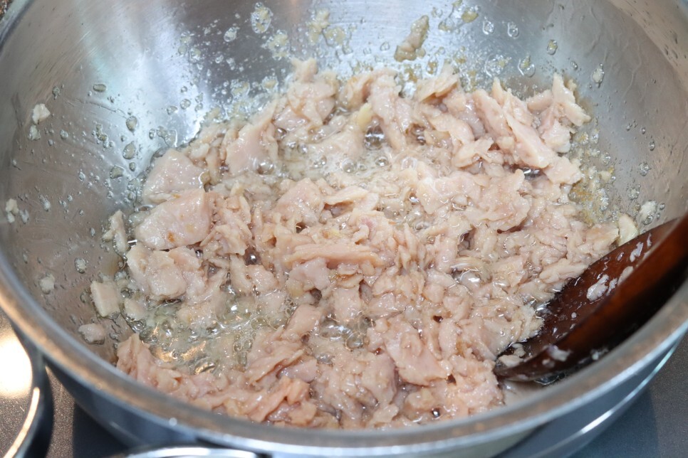 그럼 이때 으깬 스팸을 넣고 볶아주기 시작해요