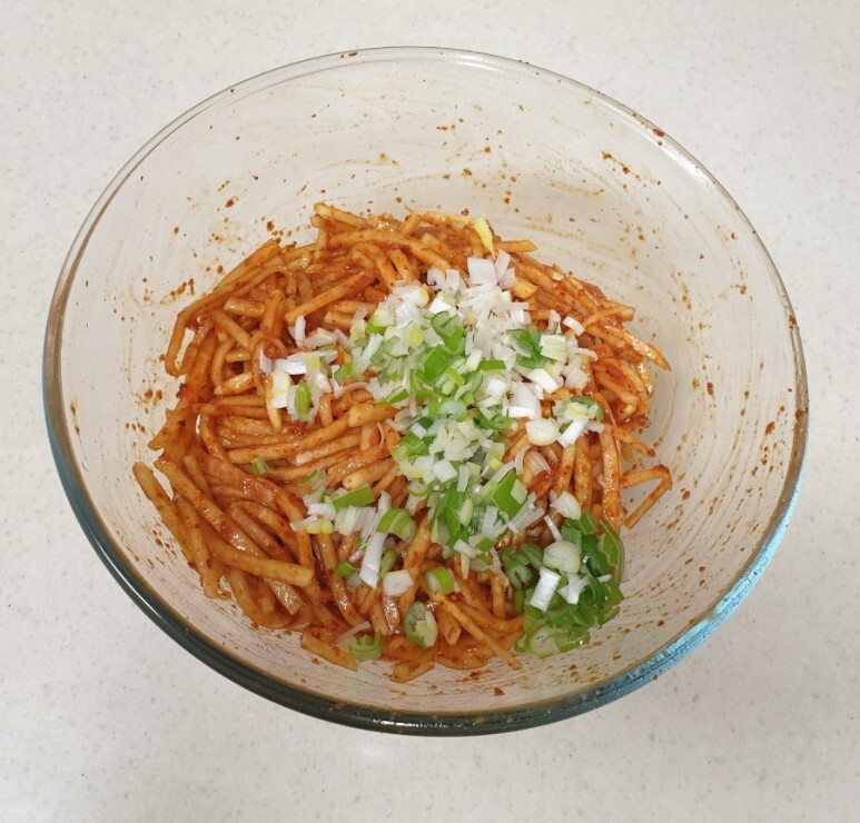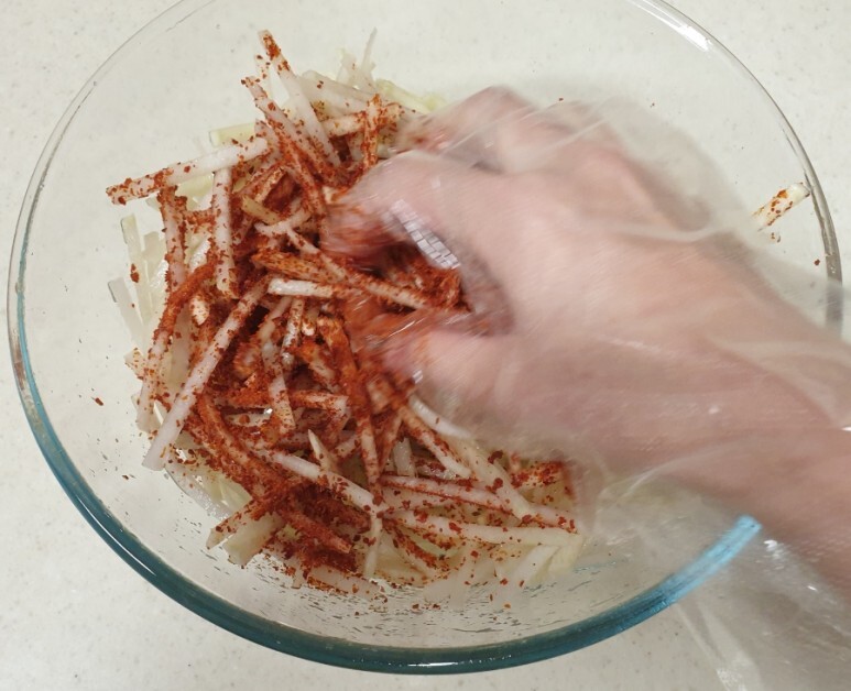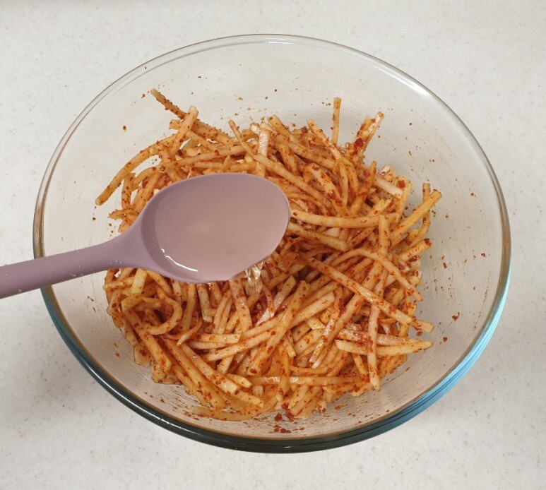고루 버무려 무에 예쁘게 빨간색을 입혀주어요.