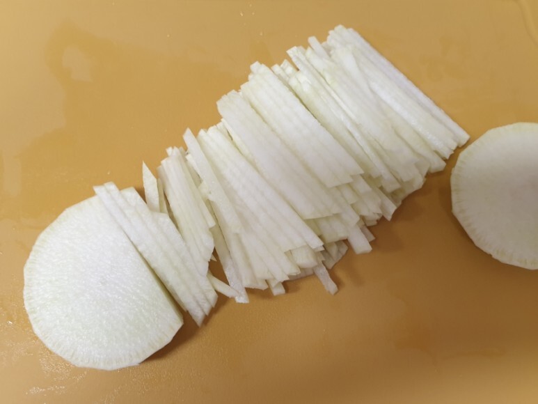 적당히 가늘고 일정한 크기로 채 썰어주었어요.